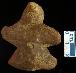 | Description / विवरण | A terracotta archaic human figurine with broad head, punched eyes, pinched nose , open slit mouth, out stretched arms, punched navel, short bridged stumpy legs, phallus indicated, treated of red wash, handmade. |