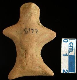| Description / विवरण | A star terracotta archaic human figurine, pin hole eyes, pinched nose, out stretched arms, short bridged stumpy legs with , treated with red wash, handmade. |