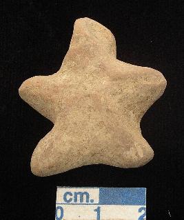 | Description / विवरण | A star shaped tiny terracotta archaic human figurine, with elongated head, pinched nose, open slit mouth, short out stretched stumpy arms, short wide bridged stumpy legs. |