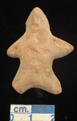 | Description / विवरण | A star shaped terracotta archaic human figurine, with round head, eyes are not seen, pinched nose, slit open mouth, short out stretched stumpy arms left one with one incised line, short wide bridged stumpy legs right one with one incised line and left one is slightly damaged, and treated with red wash. |