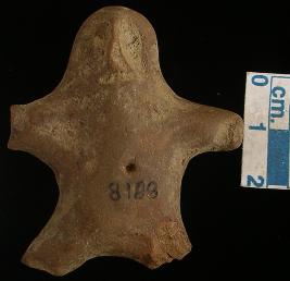 | Description / विवरण | A star shaped terracotta archaic human figurine with round head, punched eyes, pinched nose and slit open mouth, short out stretched stumpy arms, punched navel, short wide bridged stumpy legs and treated with red wash. |