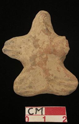 | Description / विवरण | A star shaped archaic terracotta human figurine with round head, punched hole eyes, pinched mutilated nose, short out stretched stumpy arms with two incised lines in each but left one is broken, pin hole navel, short wide bridged stumpy legs with one incised line in each, traces of red slip, handmade. |