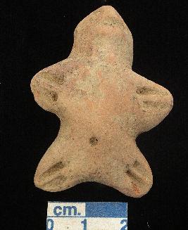 | Description / विवरण | A star shaped terracotta archaic human figurine, with round head, pin hole eyes, pinched nose, slit open mouth, short out stretched stumpy arms with two incised lines in each, pin hole navel, short wide bridged stumpy legs with two incised lines and treated with red wash. |