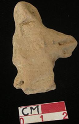 | Description / विवरण | A star shaped archaic terracotta female figurine with round head, pin hole eyes, pinched nose, slit open mouth, short out stretched stumpy left arm with two incised lines and other one is broken, right leg is slightly broken with two incised lines and other one is broken, anus indicated, treated with red wash, handmade. |