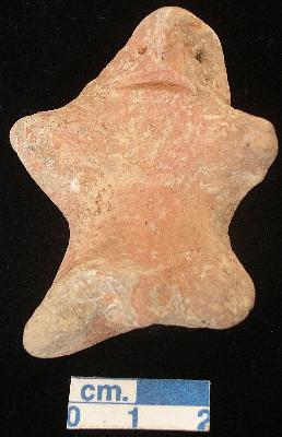 | Description / विवरण | An arahaic terracotta male figurine with rounded head, pin hole eyes, pinched nose, slit open mouth, short out stretched stumpy arms, short wide bridged stumpy legs, phallus indicated, treated with red wash. |