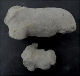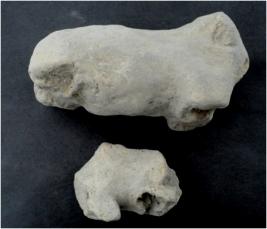 | Description / विवरण | Trench E, Depth rain gully, Stratum rain gully S B layer 2. These are two bull figurine made of terracotta. Head and legs are lost of both the figurine. Small figurine is damaged at hind portion. Appearance is muddy. |