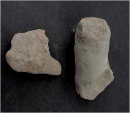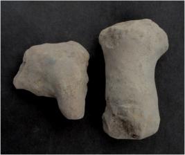 | Description / विवरण | Trench E, Depth rain gully, Stratum rain gully S B layer 2. These are two bull figurine made of terracotta. Head and legs are lost of both the figurine. Small figurine is damaged at hind portion. Appearance is muddy. |