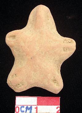 | Description / विवरण | A star shaped terracotta archaic human figurine with round head, punched eyes, pinched nose, short out stretched stumpy arms of which right has one incised line and left has two incised lines. Both short wide bridged stumpy legs is intact of which right leg has two incised lines and left leg has one incised line, treated with red wash, handmade. |