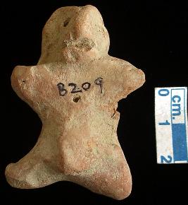 | Description / विवरण | A terracotta archaic male figurine with round head, dull red colour, punched hole eyes, pinched nose and slit open mouth, short out stretched stumpy arms, pin hole navel, short wide bridged stumpy legs, phallus indicated, treated with red wash, handmade. |