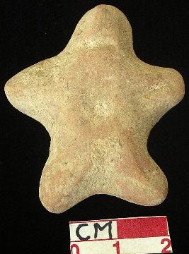 | Description / विवरण | A star shaped terracotta archaic human figurine with round head, punched eyes, pinched nose, slit mouth, out stretched stumpy arms, punched navel, wide bridged stumpy legs, treated with red wash, handmade. |