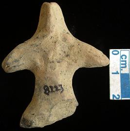 | Description / विवरण | A terracotta archaic human figurine with elongated head, dull red colour, pinched nose, long out stretched stumpy arms, both legs are totaly broken, traces of red wash, handmade. |