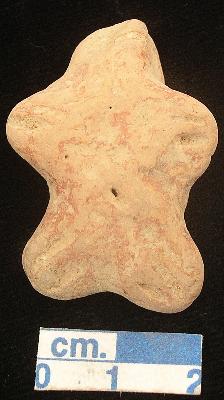 | Description / विवरण | A star shaped archaic terracotta male figurine with round out head, pin hole eyes, pinched nose, slit open mouth, short out stretched stumpy arms with three incised lines in each, pin hole navel, short wide bridged stumpy legs with three, incised lines in each. |