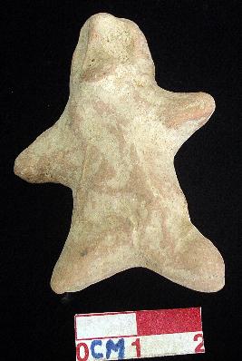 | Description / विवरण | A terracotta archaic human figurine with round head, pinched nose, wide open slit mouth, out stretched stumpy arms, wide bridged stumpy legs, treated with red wash, handmade. |