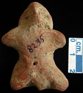 | Description / विवरण | A terracotta archaic male figurine with round head, pinched nose, punched eyes, slit mouth, out stretched stumpy arms, short wide bridged stumpy legs, punched navel, phallus indicated, treated with red wash, handmade. |