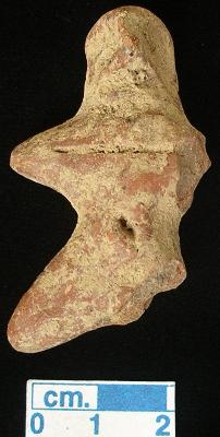 | Description / विवरण | A terracotta archaic human figurine with round head, dull red colour, pin hole eyes, pinched nose, slit open mouth, short wide out stretched arms but left one is broken, punched navel, short wide bridged stumpy legs, traces of red wash, handmade. |