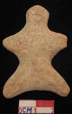 | Description / विवरण | A star shaped terracotta archaic human figurine with dull red colour, flat head, punched eyes, pinched nose and slit mouth, short out stretched stumpy right arm but left arm is broken, wide bridged stumpy legs with three incised lines in each and treated with red wash, handmade. |