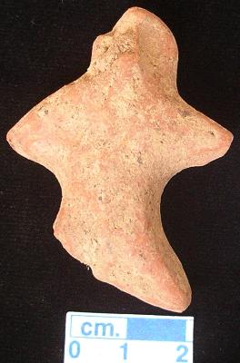 | Description / विवरण | An archaic human terracotta figurine, red, pinched nose, split mouth, short out stretched arms, shrot wide bridged stumpy leg and right leg is broken, punched eyes, handmade. |