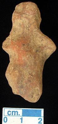 | Description / विवरण | An archaic human terracotta figurine with mutilated face, red, short out stretched arms, shrot wide bridged stumpy legs but the right one is broken, handmade. |