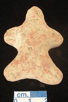 | Description / विवरण | A flat star shaped terracotta archaic human figurine, with round head, pin hole eyes, pinched nose, open slit mouth, short out stretched stumpy arms with two incised line in each, pin hole navel, short wide bridged stumpy legs with two incised line in each, traces of red slip on exterior. |