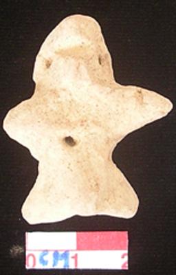 | Description / विवरण | A star shaped archaic terracotta male figurine with round head, pinched nose, slit open mouth, short out stretched stumpy arms but right one is smaller than other, pin hole navel, short wide bridged stumpy legs, phallus indicated, handmade. |