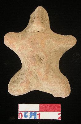 | Description / विवरण | A star shape archaic human terracotta figurine, red, punched eyes, pinched nose, open slit mouth, short out stretched arms, punched navel, short wide bridged stumpy legs, treated with red wash, handmade. |