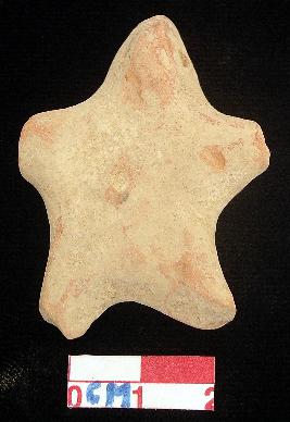 | Description / विवरण | A star shape archaic human terracotta figurine, red, punched eyes, pinched nose, short out stretched arms but both are partly broken, traces of navel, short bridged stumpy legs but both are mutilated, treated with red wash, handmade. |
