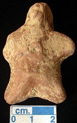 | Description / विवरण | A terracotta human figurine with rounded head, red colour, pin hole eyes, punched nose, slit open mouth, short out stretched left arm but right arm is broken, pin hole navel, short wide bridged legs, treated with red wash, handmade. |