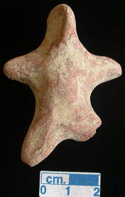 | Description / विवरण | An archaic human terracotta figurine, red, punched nose, pinched eyes, slit open mouth, short out stretched arms and legs, handmade. |