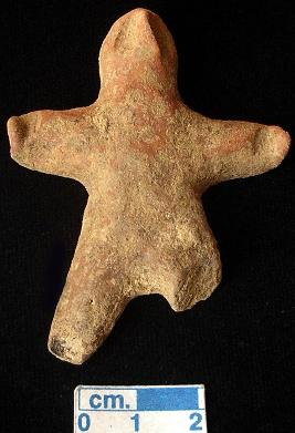 | Description / विवरण | A terracotta human figurine with bun head, red colour, pin hole eyes, punched nose, slit mouth, short out stretched arms, short wide bridged right leg but left leg is broken, treated with red wash, handmade. |