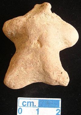 | Description / विवरण | An archaic human terracotta figurine, red, punched nose, pinched eyes, slit open mouth, short out stretched arms and legs, handmade. |