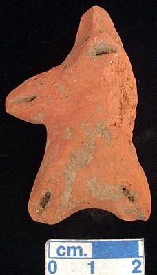 | Description / विवरण | An archaic terracotta human figurine with pointed head, red, pinched nose, pin hole eyes, slit mouth, short out stretched arms with one incuised line on the right one and the left one is broken, short wide bridged stumpy legs with one lincised line on each, treated with red wash, handmade. |