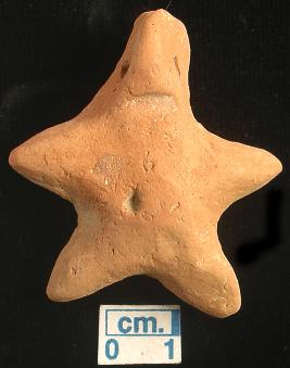 | Description / विवरण | A star shaped terracotta archaic human figurine, red, pinched nose, pin hole eyes, slit mouth, short out stretched arms, pin hole navel, short wide bridged stumpy legs, handmade. |