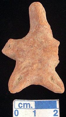| Description / विवरण | An archaic terracotta human figurine with elongeted head, red, pinched nose, short out stretched arms but the left one is broken and the right one is slightly damaged, short wide bridged stumpy legs with one incised lines on each, treated with red wash, handmade. |