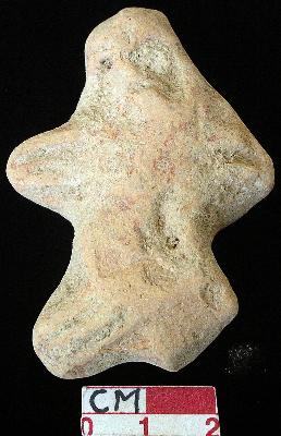 | Description / विवरण | A defaced terracotta archaic human figurine with flat on top head, mouth, short out stretched stumpy arms with two incised lines but left is slightly broken, short wide bridged stumpy legs with two incised lines in right leg but other is mutilated, red colour, handmade. |