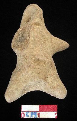 | Description / विवरण | An archaic human terracotta figurine, dull red, punched eyes, pinched nose, open slit mouth, short out stretched arms but the right one is broken, punched navel, short wide bridged stumpy legs, phallus indicated, handmade. |