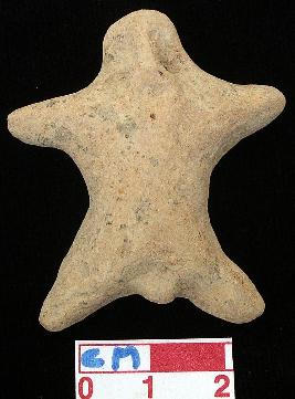 | Description / विवरण | A terracotta archaic human figurine with small flat head, red, punched eyes, pinched nose and mouth, short out stretched pointed arms, short stumpy pointed legs , devoid of any surface treatment, phallus indicated, handmade. |