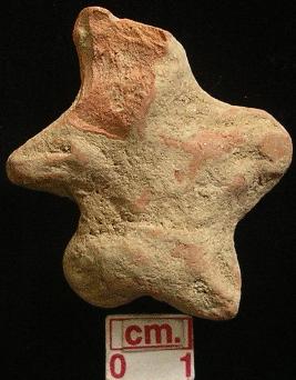 | Description / विवरण | Terracotta archaic human figurine with broken head, short out stretched uneven arms with two incised line on each, short wide bridged legs with two incised line on each, handmade. |