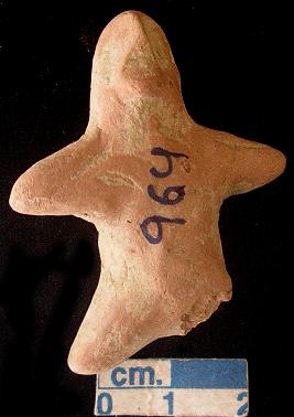 | Description / विवरण | Terracotta archaic human figurine, red, pinched nose, pin hole eyes, slit open mouth, short out stretched arms, short wide bridged legs but left one is broken, handmade. |