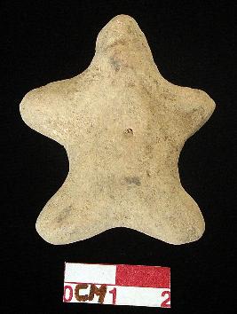 | Description / विवरण | A star shape archaic human terracotta figurine, red, punched eyes, pinched nose, open slit mouth, short out stretched arms, pin hole navel, short wide bridged stumpy legs, treated with red wash, handmade. |