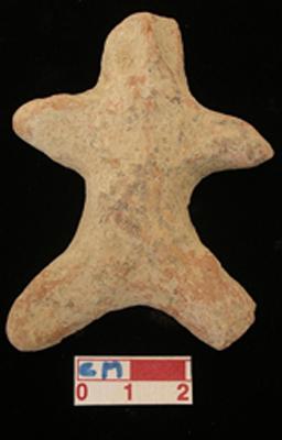 | Description / विवरण | A star shaped archaic terracotta human figurine with round head, pinched nose, short out stretched stumpy uneven arms, long wide bridged uneven legs but left one is slightly broken, traces of red wash, handmade. |
