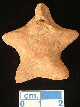 | Description / विवरण | A star shaped terracotta archaic human figurine with small round head, red colour, pin hole eyes, pinched nose, pin hole mouth, short out stretched pointed arms, short wide bridged legs, treated with red wash, handmade. |