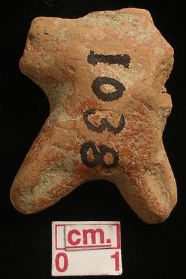 | Description / विवरण | Terracotta archaic female figurine, red, broken head and arms, short wide bridged stumpy legs with one incised lines on each, handmade. |