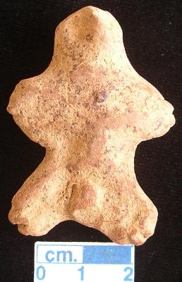 | Description / विवरण | An archaic male terracotta figurine, red, punched nose, pinched eyes, slit open mouth, short out stretched arms and legs with two incised lines in each, pinhole navel, handmade. |