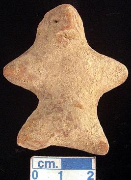 | Description / विवरण | A star shape terracotta archaic human figurine, red, pin hole eyes, pinched nose, open slit mouth, short out stretched arms, short bridged stumpy legs, treated with red slip, handmade. |