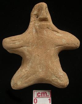 | Description / विवरण | A star shaped terracotta archaic figurine, dull red, pinched nose, punched eyes, slit mouth, short out stretched arms, short wide bridged stumpy legs, handmade. |