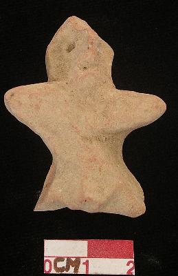 | Description / विवरण | A small terracotta archaic human figurine with dull red colour, damaged head, punched eyes, pinched nose and slit open mouth, short out stretched stumpy arms, punched navel, both legs are broken, phallus indicated and treated with red wash, handmade. |