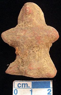 | Description / विवरण | An archaic male terracotta figurine, red, pinched nose, slit mouth, short out stretched arms, short wide stumpy legs punched eyes, phallus indicated, handmade. |