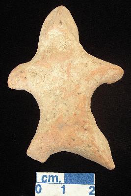 | Description / विवरण | A star shaped terracotta archaic human figurine, with round head, red, hand made, pinched nose, shallow open slit mouth, short out stretched stumpy arms right one is small than left, short wide bridged stumpy legs right one partly broken. |