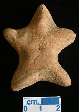 | Description / विवरण | A star shaped terracotta archaic human figurine with short head, punched eyes, pinched nose, and mouth, short out stretched stumpy arms, punched navel, short wide bridged stumpy legs, red color. |