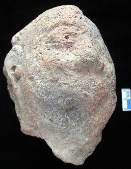 | Description / विवरण | A fragment of human face, red in colour, left half portion missing, oval shaped face, combed hairs, wide ears with pin hole lobe, bears a dotted ears stud, broad right eye with small punched pupil, eyebrow clearly visible, prominent and conical shape nose, mouth is not clearly seen, long chin, convex profile, made with single mould. |